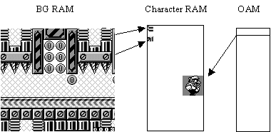 For backgrounds, a portion of memory corresponding to the screen is used to point to character data to be displayed at a given location.